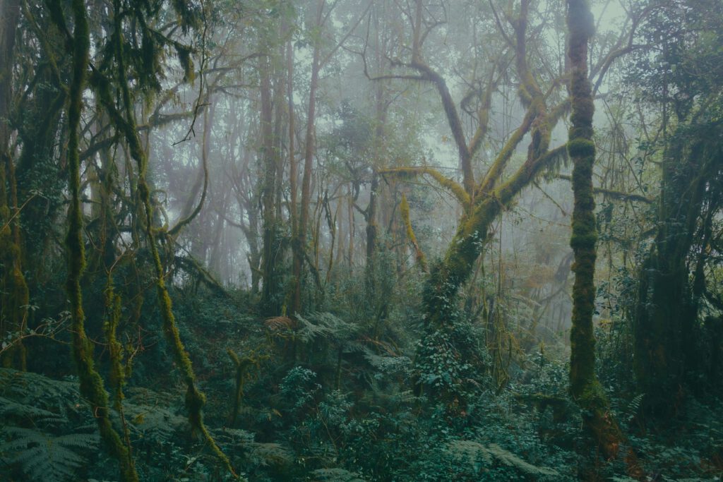 -“Diese große Mauer aus Pflanzen, ein üppiges und verfilztes Gewirr aus Stämmen, Zweigen, Blättern, Ästen, Ranken, reglos im Licht des Mondes, glich einer wild wuchernden Invasion des lautlosen Lebens, einer heranrollenden Woge aus Pflanzen, hoch aufgetürmt, brechend, bereit auf die Bucht niederzustürzen und jedes von uns kleinen Menschlein aus seinem kleinen Dasein hinwegzufegen.”